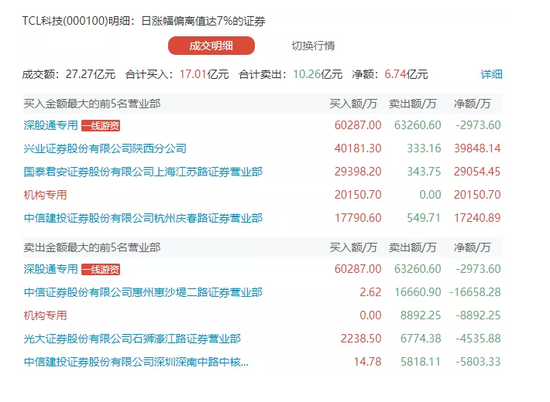 盘后数据显示,北向资金位居买一、卖一席位,买入6.03亿元并卖出6.33亿元;一个机构席位买入2.02亿元,另一个机构席位卖出8892万元。此外,兴业证券陕西分公司买入4.02亿元。