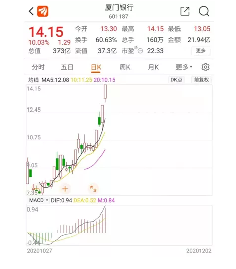 厦门银行“四天三板”,截至2日收盘,报收14.15元/股,总市值达373亿元。值得注意的是,厦门银行今年10月27日刚刚在上交所主板上市,发行价为6.71元/股,上市首日开板,次日跌停,而目前较发行价涨幅达110.88%。在银行股普遍“破净”的大环境下,厦门银行市净率达2.12,仅次于宁波银行;动态市盈率达22.33,是目前市场上银行股中最高的。