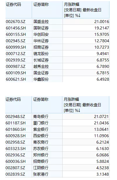 12月份大盘迎来开门红,金融股纷纷发力,仅2个交易日,国盛金控、国联证券、华创阳安、华林证券、招商证券5只券商股就涨超10%,青岛银行、厦门银行、紫金银行、西安银行4只银行股涨超10%。
