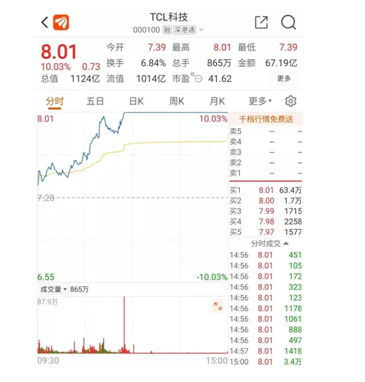 TCL科技今日放量涨停,截至收盘报收8.01元/股,创历史新高,其总市值达1124亿元,全天换手率6.84%,成交量67.19亿元。