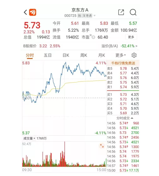 京东方A今日上涨2.32%,盘中股价一度达5.83元/股追平了2月份创下的年内高点。截至收盘,京东方A报收5.73元/股,总市值达1994亿元。
