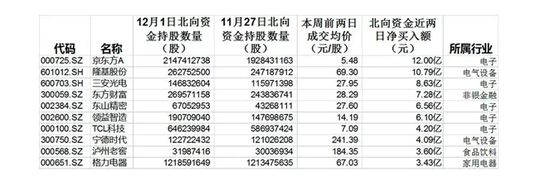 港交所12月2日盘前公布的北向资金的最新持股记录显示,北向资金开始向科技股回流。本周前两个交易日,北向资金净买入额排名前十的股票,有5只来自于电子行业,分别是京东方A、三安光电、东山精密、领益智造和TCL科技。