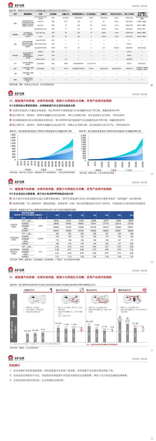 中国新能源汽车2020年的总销量受疫情冲击较大,但私人消费强劲,印证中国新能源汽车产业正在从“补贴导入”向“产品力驱动”转型,我们不宜低估新能源汽车产业进入“正向循环”之后的成长加速度。在全球市场共振、传统车企与造车新势力共舞的时代,优秀车型或不断“涌现”,电池技术的进步迭代也有望加速,平价时代有望提前到来。