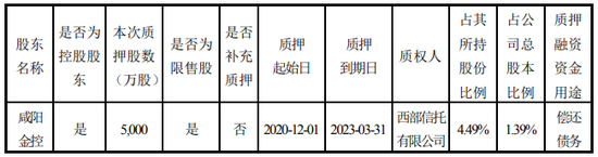 彩虹股份同日还披露了关于控股股东股份质押的公告,彩虹股份的控股股东咸阳金融控股集团有限公司(以下简称“咸阳金控”)于2020年12月1日新增质押彩虹股份5000万股,占咸阳金控所持股份比例的4.49%,占彩虹股份总股本比例的1.39%,质押融资资金用途为偿还债务,质押到期日为2023年3月31日,质权人为西部信托有限公司。