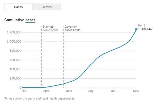 其中加州目前已经累计有超126.5万人感染,近2万人死亡,且周三一天就有1.87万个新增病例和116个死亡病例。