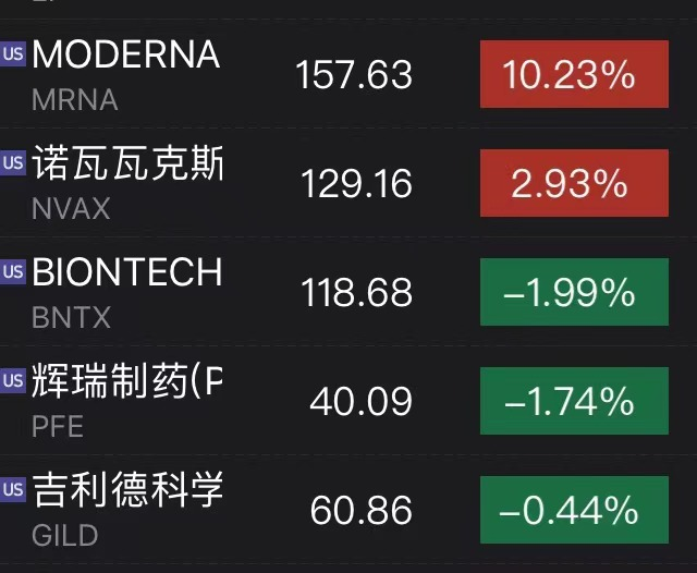 另外两只疫苗概念股Moderna和诺瓦瓦克斯尾盘则出现了一波拉升,Moderna收盘大涨10.23%,诺瓦瓦克斯涨2.93%。