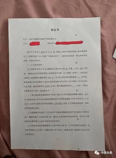 由另一位购房者提供的一份《借款合同》显示:经甲乙双方友好协商,就乙方向甲方提供借款相关事宜,乙方自愿向甲方提供借款,借款用于甲方经营。双方约定,乙方应向甲方提供借款本金人民币1100余万元,乙方与2019年7月X日,全部汇入甲方指定账户,乙方借款本金全部汇入甲方账户作为本合同生效条件。