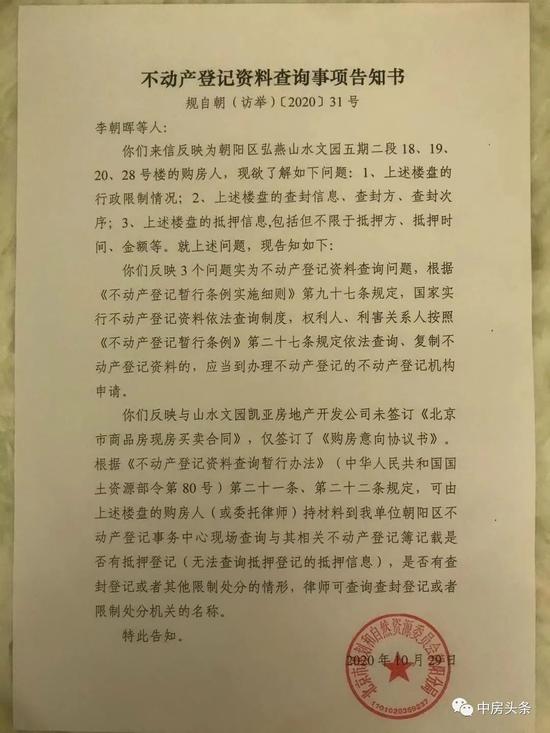 北京市自规局朝阳区分局告知书 购房者提供