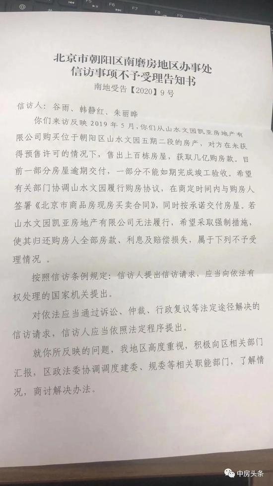 据多位受访业主介绍,目前的现状是,对于多数业主以合同诈骗为由寻求公安部门介入,但朝阳区经侦支队不予立案;朝阳区房管局于今年9月18日回复称,关于不动产登记的问题可向不动产登记事务中心咨询;北京市自然资源和规划局朝阳分局回应称,仅签订《购房意向协议书》,未签订《北京市商品房现房买卖合同》,需购房者(或委托律师)持有相关材料到不动产登记事务中心进行查询是否有登记(无法查询抵押登记的抵押信息),律师可查询查封登记或者限制处分机关名称;北京市朝阳区人民政府南磨房地区办事处对此事,则表示不予受理。