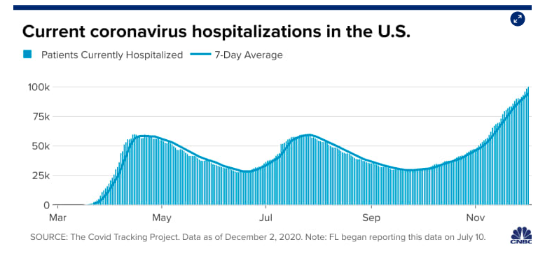 病例激增让医院几乎达到极限。根据Covid Tracking Project的数据,新冠肺炎患者住院人数周三首次超过10万人。这些住院者中包括19396人在重症监护病房,也创下纪录高位。