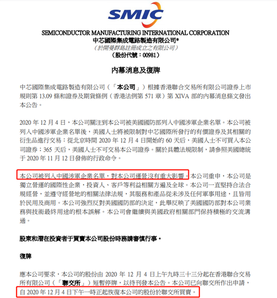 12月4日早间,中芯国际发布公告,公司表示关注到美国国防部网站有一则将公司加入中国涉军企业名单的消息,公司正在评估影响。