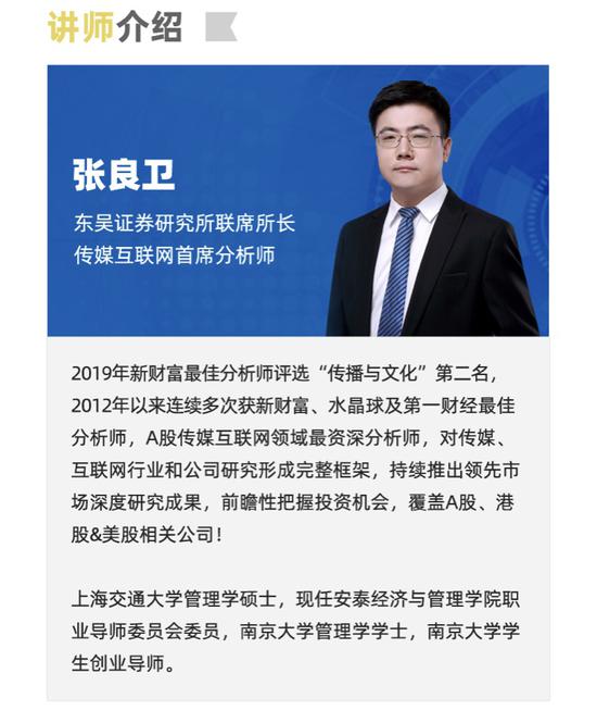 别急!基于此新浪理财大学特邀东吴证券研究所联席所长张良卫来为大家讲解2021传媒互联网投资新风向,为你细数当今互联网的细分领域,如何把握电商机遇,以及为你解答当下投资新风口的网红经济!