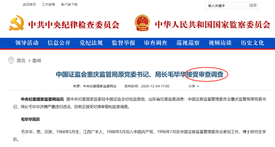 12月4日晚间,中央纪委国家监委网站讯,据中央纪委国家监委驻中国证监会纪检监察组、山东省纪委监委消息:中国证券监督管理委员会重庆监管局原党委书记、局长毛毕华涉嫌严重违纪违法,目前正接受纪律审查和监察调查。