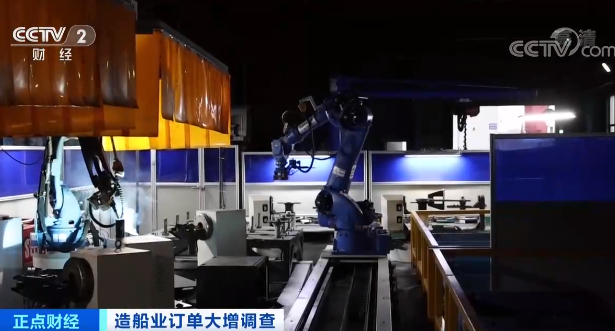 造船技术难题一个个被攻克的同时,不少船厂在生产制造方面也是开足马力,在江南造船厂的智能车间里,记者看到,三台机器人分工合作,上料、焊接、打磨,十几分钟就能生产出一个吊码,据了解这是造船厂的第一个智能生产车间。