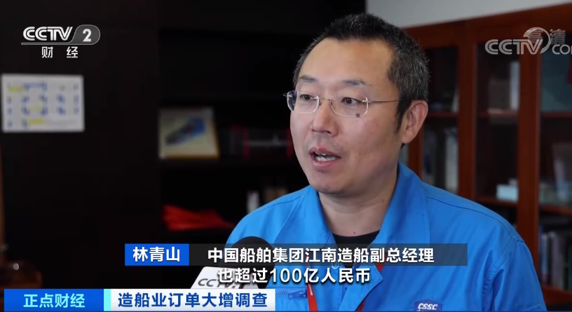 中国船舶集团江南造船副总经理 林青山:今年产值预计超过100亿元人民币,我们的VLGC(液化气船)市场占有率达到全世界市场的57%,同时集装箱船方面在年底也有一批订单,对我们来说,订单基本上排到2023年下半年。