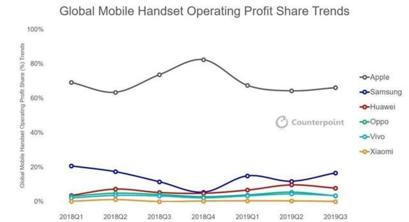根据Counterpint Research的最新估算,2018年第一季度到2019年第三季度,全球智能手机行业的总营业利润为1000亿美元,而iPhone占据了66%,并在2018年第四季度达到了80%的峰值,未来可能会继续保持。