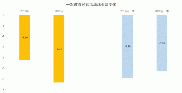 最直观的是经营活动现金流,2018年、2019年以及2020年前三季度,一起教育常年处于现金净流出的状态,分别流出4.19亿、6.31亿和5.26亿元,累计现金流出高达15.77亿元,而这一时段的累计营业收入为15.25亿元。纵观其他上市公司,无论是有道还是跟谁学,都没有出现如此大幅度的现金净流出。这样的经营状态,风险隐患不小。