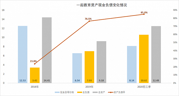 另外,资产负债情况也已展现了经营层面的压力。2018年至今,一起教育的总负债持续上升,资产负债率从23.8%一路陡增到85%、扩大了2.6倍。现金情况则从2018年末的12.53亿减少到今年9月末的8.14亿,缩水逾三成。三季度末的8.14亿现金,按一起教育的“烧钱速度”来看,甚至可能无法支撑未来三个季度的经营。