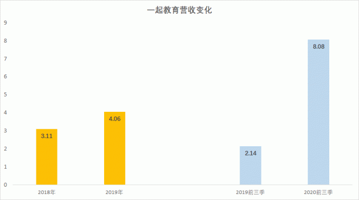 积极的一面是,该业务确实带来了整体规模的大幅提升。特别是进入2020年,站上风口的一起教育,前三季度实现营收8.08亿元,同比大幅增加277.6%。前三季度已经是去年全年营收近2倍。