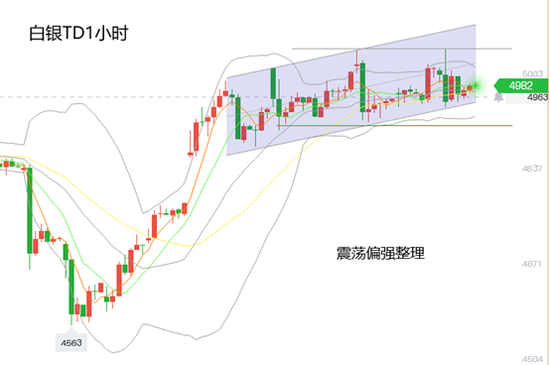 白银TD本周初大涨之后,在最后两天价格上升有限,多次遇阻回落向下试探,尽管之后银价很快收复当天跌幅,但上方也表现出了明显的压力,这使得白银走势逐渐偏向震荡整理,需要消息进一步的指引,才能打开上行空间。下方支撑:关注日线布林带中轨4973元附近,日线5日均线4944元附近,1小时布林带下轨4928元附近,以及4900元整数关口位置。上方阻力:关注5000元整数关口位置,1小时布林带上轨5014元附近,本周反弹高点位置5047元附近,以及周线10日均线5070元附近。总体而言,白银TD上涨多次冲高回落,说明上方存在较强压力,银价上涨仍需消息指引,目前白银走势开始维持震荡整理,可暂时先关注4900元到5050元区间,高沽低渣即可。