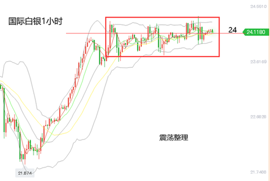 国际白银本周初大涨之后,最近三天走势收窄,围绕24美元高位震荡整理,上下方均表现出了一定的支撑与阻力强度,若无更多市场消息指引,预计短期内仍将保持震荡走势。下方支撑:关注4小时布林带中轨24美元关口,日线布林带中轨23.8美元附近,4小时布林带下轨和日线5日均线23.7美元附近,日线10日均线23.5美元附近。上方阻力:关注1小时和4小时布林带上轨24.3美元附近,本周白银反弹新高24.4美元附近,日线布林带上轨和周线布林带中轨25美元关口位置。总体而言,本周国际白银反弹遇阻后,维持高位震荡整理,短期走势没有明确的方向性,建议暂时围绕24.3美元到23.7美元区间高沽低渣即可。