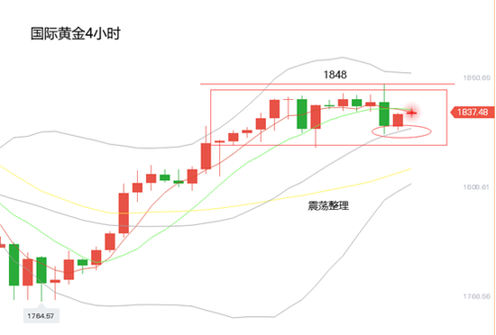 国际黄金本周大涨,走势表现强劲,金价在刷新近五个月新低1764美元后开始反弹,并刷新一周新高至1848美元,这是近期金价跳水大跌之前,国际黄金走势的主要支撑位置,不够金价并未取得突破,对此试探这里展开回落,显示了较强的压力。下方支撑:关注1小时布林带下轨和4小时布林带中轨1831美元附近,日线5日均线1820美元附近,4小时10日均线1814美元附近,以及1800美元整数关口位置。上方阻力:关注1小时布林带中轨和4小时10日均线1839美元附近,也是上周五金价遇阻回落后反弹的高点位置,其次上周反弹高点位置1848美元附近。总体而言,国际黄金本周表现强势,但上方也显示较强压力,关注1848美元下方可逢高寻求做空机会,下方回落1831美元附近可寻求初步做多机会。