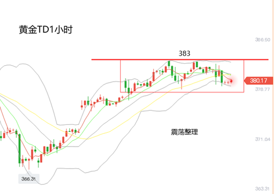 黄金TD本周大涨,金价在刷新近7个月新低366.3元后向上反弹,在周四触及本周高点383.2元展开回落,尽管之后金价多次试探本周新高附近,但始终未能取得突破,上方表现出了较强的压力。下方支撑:关注日线5日均线378.8元附近,日线10日均线378.1元附近,4小时布林带中轨376.8元附近。上方阻力:关注1小时布林带中轨和4小时5日均线381.1元附近,1小时布林带上轨383元附近,周线5日均线385元附近。总体而言,黄金TD本周上涨遇阻,走势开始维持震荡整理,可以先关注378元到383元金价运行情况,高沽低渣即可。