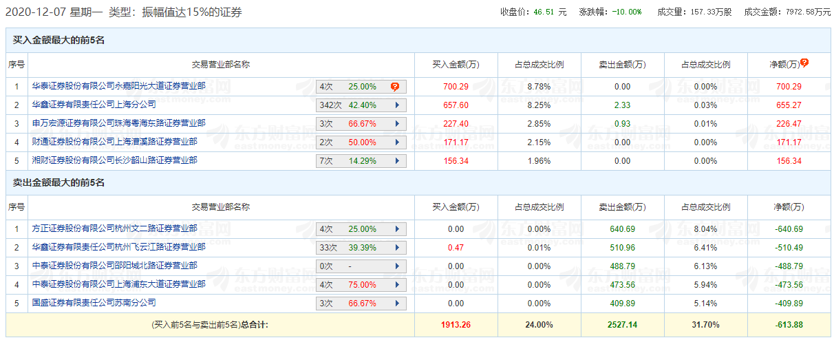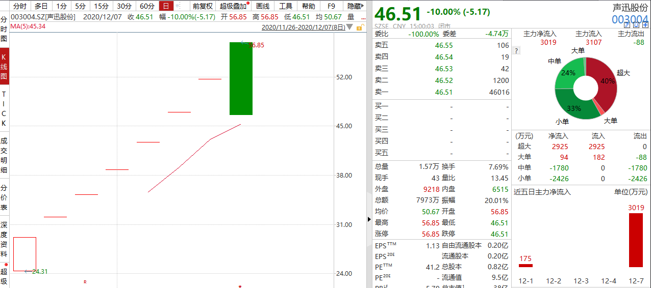 截至收盘,声迅股份收报46.51元,仍有4.6万手卖单压在跌停板,换手率7.69%。