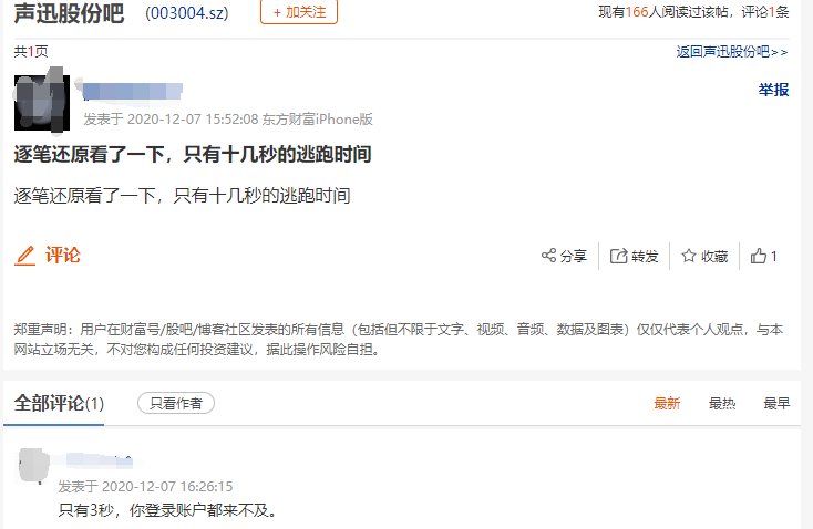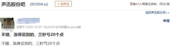 对此,有网友在股吧评论表示,“逐笔还原看了一下,只有十几秒的逃跑时间”,“只有3秒,登录账户都来不及”;“不错,涨停买到的,三秒亏20个点”。