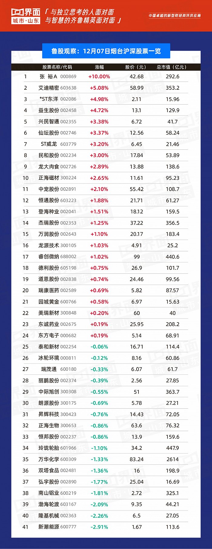 烟台市涨幅榜首:张裕A(000869),涨幅10.00%,股价42.68元,总市值292.6亿元;