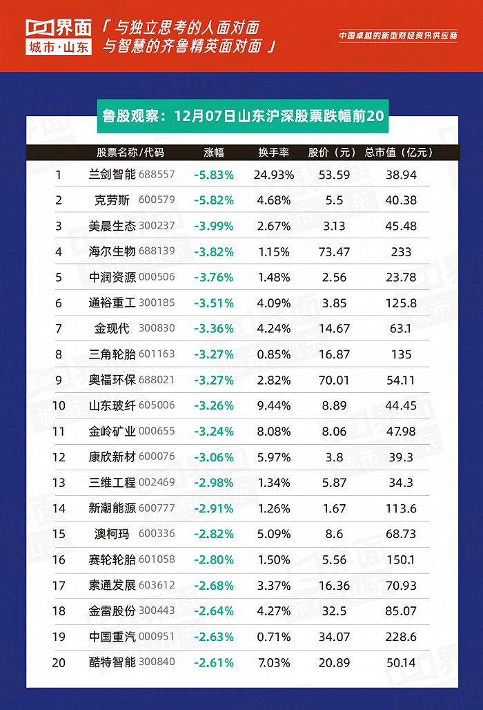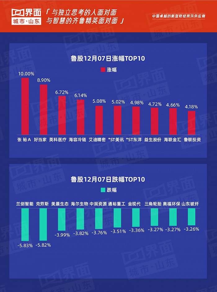受大盘影响,12月7日,山东省内沪深股票80只个股上涨,140只股下跌,4股持平。