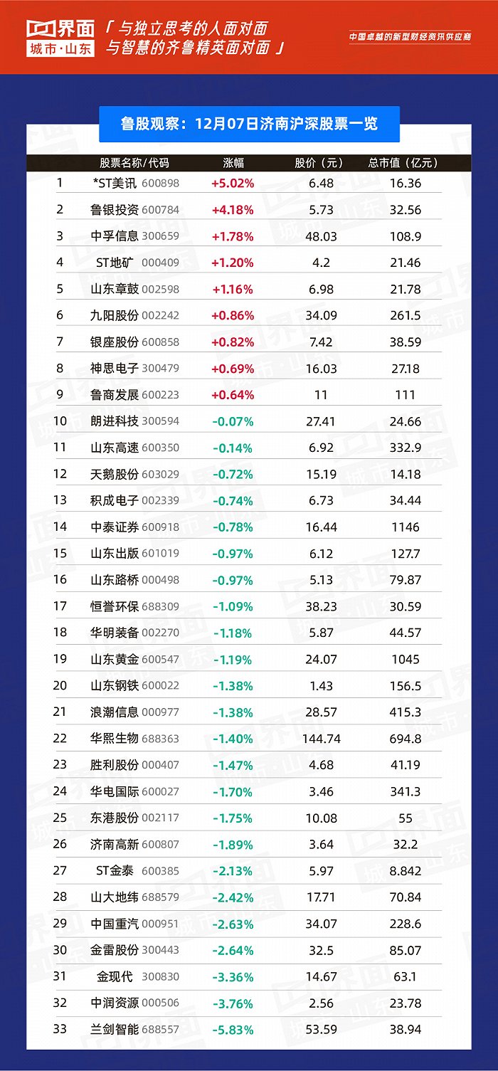 济南市涨幅榜首:ST*美讯(600898),涨幅5.02%,股价6.48元,总市值16.36亿元;
