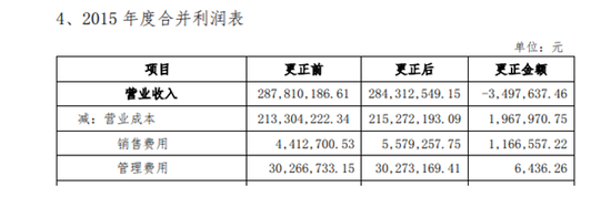 第一波发生在2017年6月,精密科技主要对2014年和2015年的数据进行差错更正。比如,公司2014年年末的存货由2971.45万元改为3794.16万元;公司2014年年末的未分配利润由-767.37万元改为-1577.16万元;公司2015年净利润由3044.15万元改为2638.14万元。