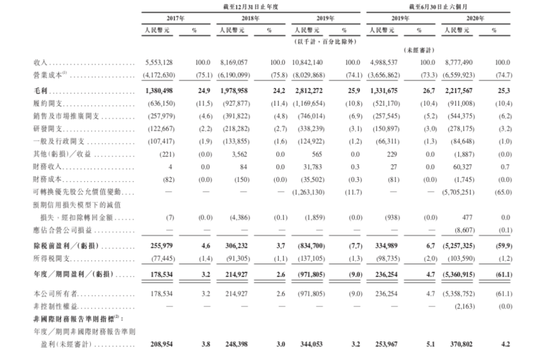招股书显示,2017年、2018年、2019年及截止2020年6月30日,,京东健康的营业收入分别为55.53亿元、81.69亿元、108.42亿元与87.77亿元;同时期内,京东健康的盈利情况分别为2.09亿元、2.48亿元、3.44亿元及3.71亿元。