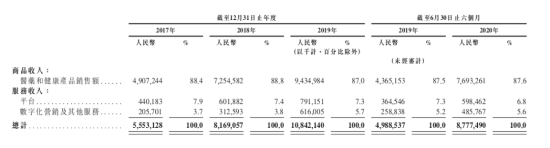 在收入结构上,京东健康的近九成收入来自零售药房业务。根据招股书,2017年-截止2020年6月30日,京东健康的医药和健康产品销售额分别为49.07亿元、72.55亿元、94.35亿元及76.93亿元,占比总营收分别为88.4%、88.8%、87.0%及87.6%。