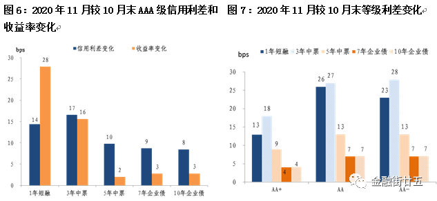 高等级信用债收益率曲线平坦化上行。截至11月末,高等级AAA信用债1年、3年、5年、7年和10年期收益率分别较10月末上行28BPs、16BPs、2BPs、3BPs、3BPs。信用利差走阔。截至11月末,AAA级1年、3年、5年、7年和10年期信用利差别较10月末拓宽14BPs、17BPs、10BPs、9BPs和8BPs。11月,永煤、紫光等AAA级国有企业接连发生违约,市场恐慌情绪蔓延,引发信用债市场剧烈震荡,信用债质押融资门槛抬升,信用风险的冲击进一步演变为阶段性的流动性冲击。二级市场方面,同区域、同行业的弱资质国企信用债遭抛售,部分债基和资管产品净值下跌,赎回压力骤增,进一步加剧市场抛压,信用债收益率大幅上行,信用利差明显拓宽。一级市场方面,信用债取消或推迟发行的数量和规模显著扩大,市场融资功能直接受到冲击。