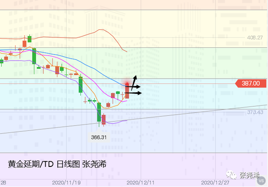 黄金TD:金价自昨日晚间低开于379.90元/克后直接反弹上行走高,延续至今日周二白盘再度刷新反弹高点,初步站稳中轨线,最高触及387元,指标上,KDJ金叉向上保持并散发,MACD红色柱持续增强,快慢线也金叉保持,暗示仍存在进一步走高。
