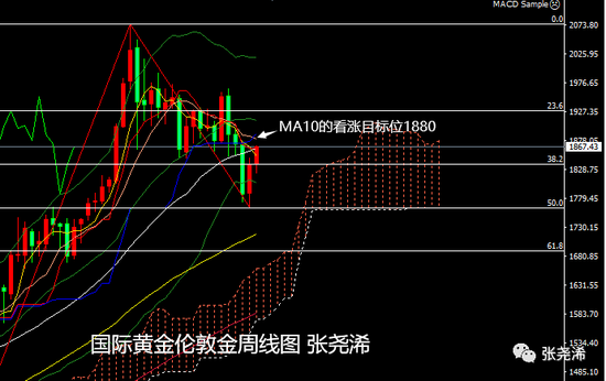 周线级别,金价本周走低后转涨,并延续上周止跌反弹力度,目前已运行至30日均线附近有所微微遇阻,但指标预期上仍偏向进一步的走高。昨日也说到,常规下这类反弹的保守目标是MA5均线1850位置(通常是MA3-MA5),强势反弹则会达到MA10,目前1850美元已经突破,则暗示金价将进一步上涨,并迈向MA10的位置1880/81美元附近,这是本周的高点预期位。