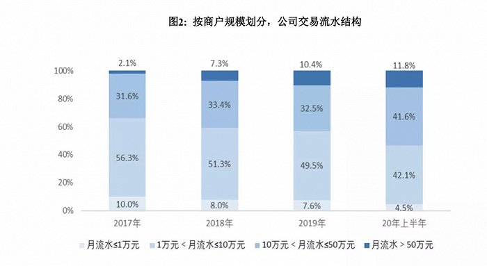 根据其2020年半年报最新数据显示,凭借硬件终端支付设备及软件PASS平台这一特色服务,其2020年度内服务商户达到215万户,其中50%左右的商户是交易流水在10-50万元的小微企业或者个体工商户,行业85%主要集中在零售业、餐饮娱乐、居民与商务服务等小额、多频行业。