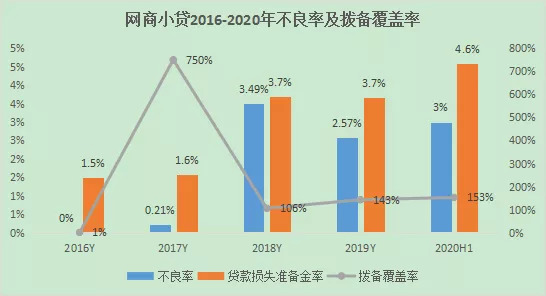 网商小贷的不良率从2017年的0.21%升至2020年上半年的3.11%,这个不良率为动态池下的不良表现,即截至资产负债表日的逾期90天以上的信贷余额与所以存量信贷余额的比值。