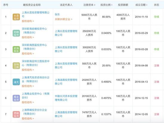 截至目前,中融长河对外投资7家公司,“存续”状态包括上海长昆投资管理有限公司(80%)、深圳前海岩峰投资中心(有限合伙)(0.04%)、深圳前海图蓝投资中心(有限合伙)(0.033%),剩余4家已注销。