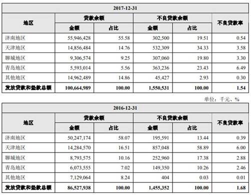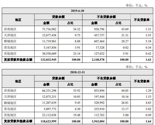 报告期内,齐鲁银行经营区域范围内经济和金融环境差异较大,导致不同区域贷款不良率存在较大差异。截至2016年末、2017年末、2018年末、2019年6月末,齐鲁银行济南地区不良贷款率分别为0.39%、0.54%、1.29%、1.31%,天津地区不良贷款率分别为6.00%、3.58%、1.53%、3.55%,聊城地区不良贷款率分别为2.88%、3.30%、4.65%、5.18%,青岛地区不良贷款率分别为2.46%、6.49%、5.02%、0.34%。