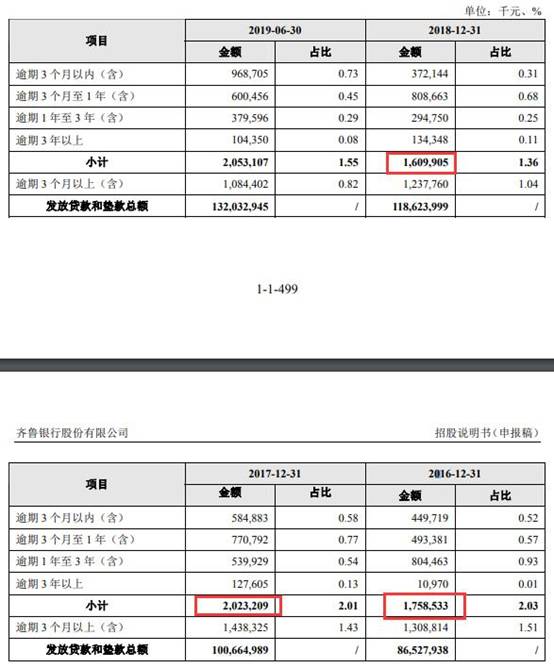 关于该行不良贷款处置情况,招股书显示,2016年、2017年、2018年、2019年1-6月,齐鲁银行核销贷款分别为8.50亿元、8.37亿元、10.11亿元、3.01亿元,转让债权余额分别为2.41亿元、9.61亿元、9.22亿元、3.02亿元。