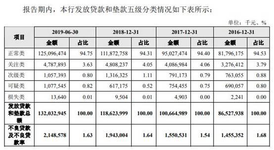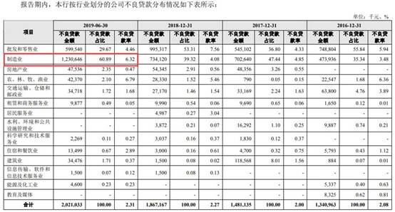 2019年上半年,齐鲁银行制造业不良贷款余额和不良贷款率均猛升。招股书显示,报告期内,从行业分布上看,齐鲁银行企业不良贷款规模最大的为批发和零售业、制造业。截至2016年末、2017年末、2018年末、2019年6月末,齐鲁银行制造业的不良贷款余额为4.74亿元、7.03亿元、7.34亿元、12.31亿元,占该行企业不良贷款总额的35.34%、47.44%、39.32%、60.89%,制造业的不良贷款率分别为3.48%、4.85%、4.08%、6.32%。
