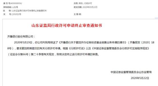 2020年5月22日,山东证监局发布的行政许可申请终止审查通知书显示,2020年5月19日,齐鲁银行向山东证监局报送了《齐鲁银行关于撤回开办证券投资基金销售业务申请的请示》(齐鲁银发〔2020〕188号),要求撤回前期提交的有关行政许可申请。根据《行政许可法》以及《中国证券监督管理委员会行政许可实施程序规定》(证监会令第66号)第二十条等有关规定,山东证监局决定终止该行政许可申请的审查。