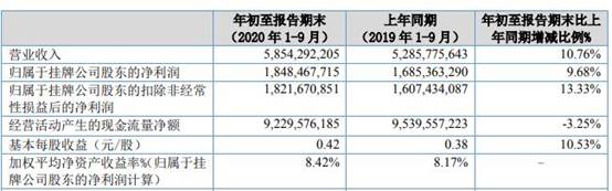 齐鲁银行2020年三季报显示,2020年1-9月,该行实现营业收入58.54亿元,同比增长10.76%;归属于挂牌公司股东的净利润18.48亿元,同比增长9.68%。