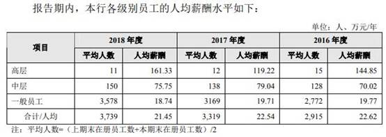 从各级别员工薪酬来看,2016年、2017年、2018年,齐鲁银行高层管理人员平均薪酬分别为144.85万元、119.22万元、161.33万元,平均人数分别为15人、12人、11人;中层管理人员平均薪酬分别为70.02万元、79.04万元、75.75万元,一般员工平均薪酬分别为19.77万元、19.71万元、18.74万元。