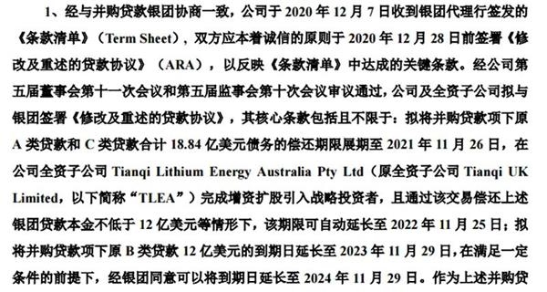 背景提要:2018年,天齐锂业向境内外银团贷款共35亿美元,用以收购智利锂业巨头SQM公司23.77%的股权。至今年11月29日,两笔剩余合计18.84亿美元的贷款已到期。