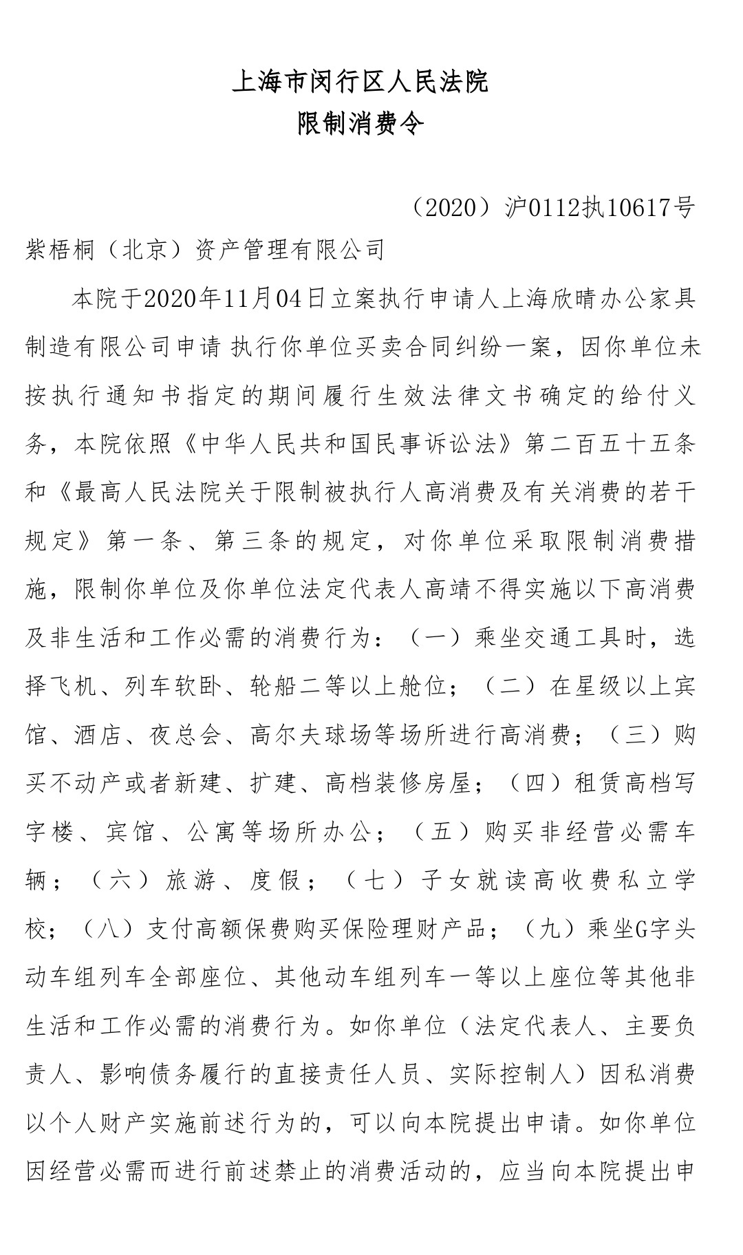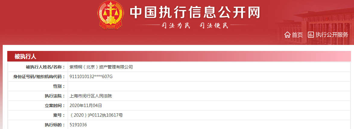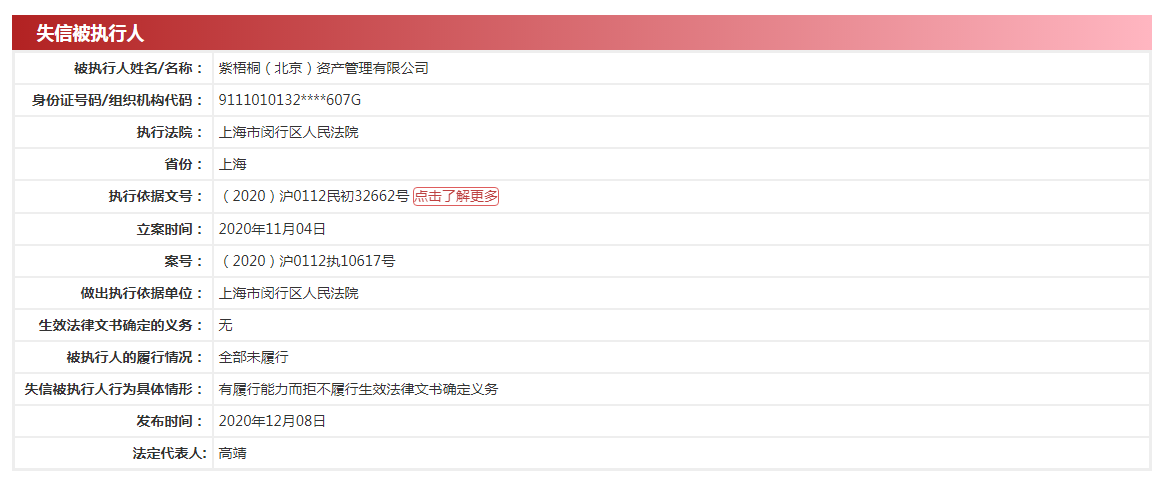 同时,近日,紫梧桐(北京)资产管理有限公司被列为失信被执行人。该案号为(2020)沪0112执10617号,执行法院为上海市闵行区人民法院,被执行人的履行情况为全部未履行。