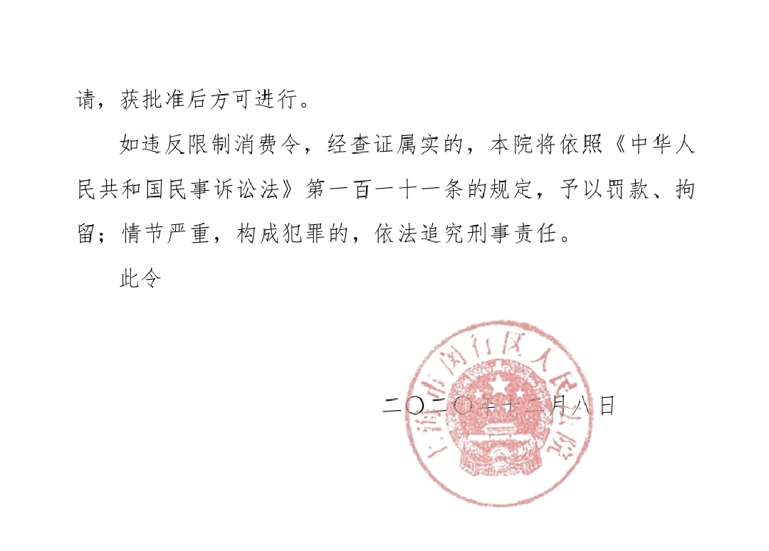 该限制消费令称,本院于2020年11月04日立案执行申请人上海欣晴办公家具制造有限公司申请执行你单位买卖合同纠纷一案,因你单位未按执行通知书指定的期间履行生效法律文书确定的给付义务,本院依照《中华人民共和国民事诉讼法》第二百五十五条和《最高人民法院关于限制被执行人高消费及有关消费的若干规定》第一条、第三条的规定,对你单位采取限制消费措施,限制你单位及你单位法定代表人高靖不得实施以下高消费及非生活和工作必需的消费行为。